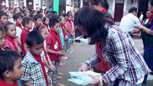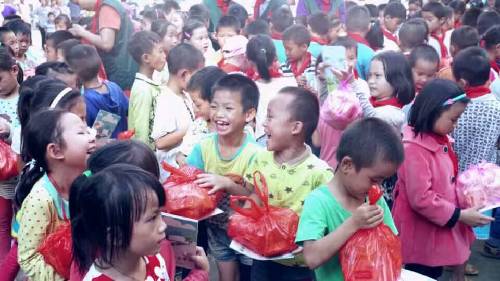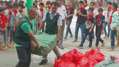 早晨7點鐘,愛心隊伍從南寧地王大廈出發(fā),途中路況極差,塵土飛舞。車隊歷經(jīng)九個小時到達泮水鄉(xiāng)村冊外小學(xué)。愛心團隊的到來,頓時令這個校園學(xué)生歡騰熱鬧起來,學(xué)生排好整齊的隊伍歡迎著愛心隊伍的到來。學(xué)生代表們給到場的每一位愛心人士戴上了感恩紅巾。